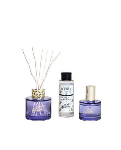 The Lolita Lempicka Violet Mini Bouquet & Home Spray Duo brings together the distinctive world of Lolita Lempicka and the elegance of Maison Berger Paris. This set features a mini scented bouquet and a home spray, both dressed in a sophisticated Violet shade, adding a poetic touch to your daily routine. The Lolita Lempicka fragrance opens with fresh ivy leaves, star anise and liquorice blossom. The heart reveals violet leaf, cherry and iris, while the base notes of tonka bean, creamy woods, caramel and cistus labdanum lend warmth and depth. The bouquet offers continuous fragrance, while the spray delivers an instant burst of scent, with up to 450– 550 sprays. A perfect gift set to delight yourself or someone special, combining practicality with refined style.