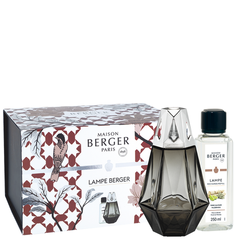 Lamp sold in a gift set with accessories: wick-burner, Prisme shiny silver diffuser cap, stopper, and funnel + 250ml Wilderness home fragrance.